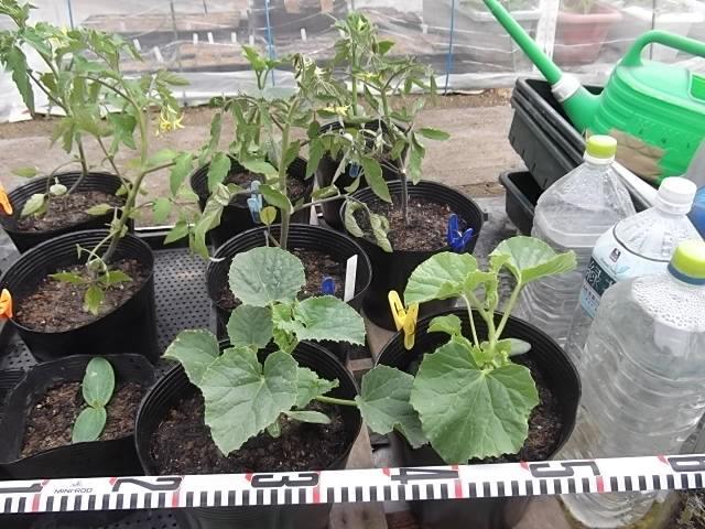 ♪野菜…近くの農家から購入したトマト(桃太郎/東光)とキュウリ、プリンスメロンの苗を径180の6号ポリポットに移植しました…カラーピンチで識別します…一定の大きさに育てば早期に収穫の終了する葉菜の畑に定植予定です… #野菜